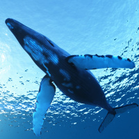blue ocean. The whale appears to be a humpback whale, characterized by its large body,