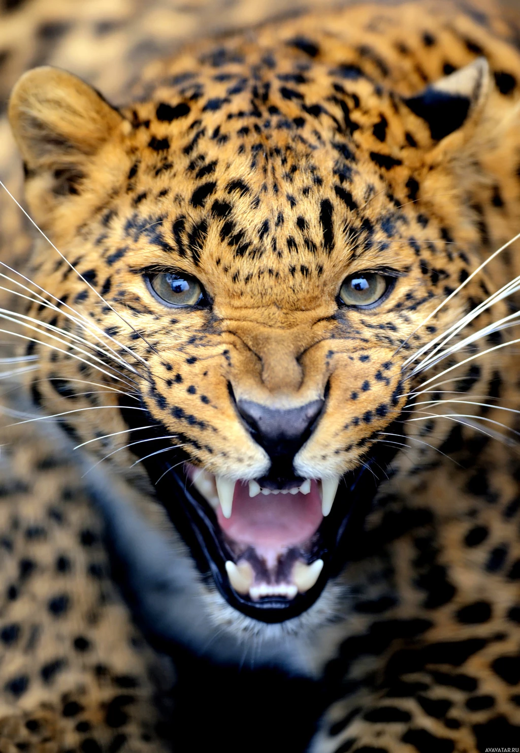 The image features a close-up of a leopard. The animal's face is prominent, and it appears to be displaying a defensive or aggressive behavior, as indicated by its wide