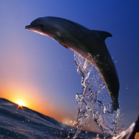 The image shows a dolphin leaping out of the water during sunset. The sky is painted with the hues of the setting sun, creating a beautiful backdrop to the scene. The ocean looks calm and serene, with gentle ripples visible on its surface.
