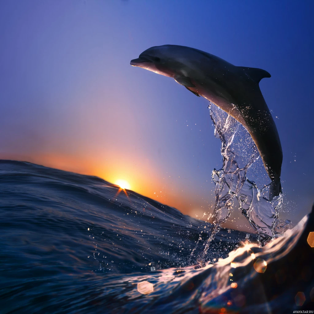 На картинке изображен дельфин, выпрыгивающий из воды на закате. Небо окрашено в оттенки заходящего солнца, что создает прекрасный фон для этой сцены. Океан выглядит спокойным и безмятежным, на его поверхности видна легкая рябь.