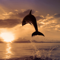 На картинке изображен дельфин, выпрыгивающий из воды во время захода солнца. Небо окрашено в оранжевые и желтые тона, отражающиеся на поверхности воды. Вдали виднеются силуэты гор.