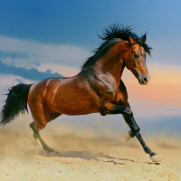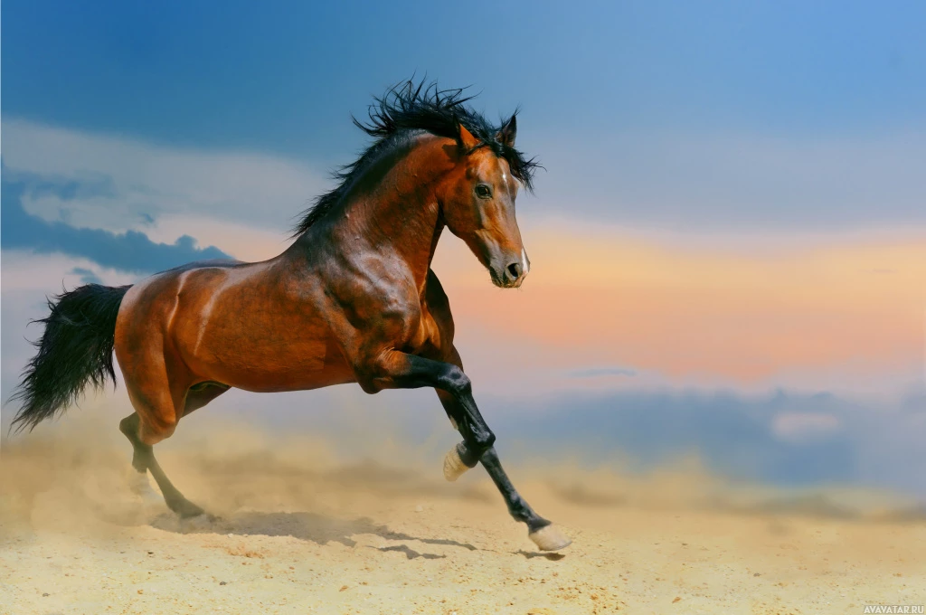 The image shows a horse galloping on what appears to be sand or dirt, possibly in a desert-like environment. The sky is blue with some clouds, suggesting it might be sunrise or midday due to