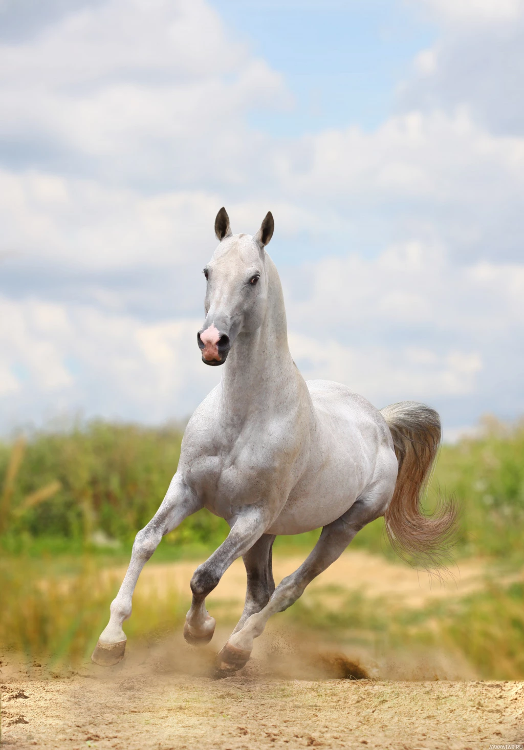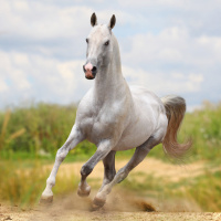 На картинке изображена лошадь в движении. На картинке изображена серая лошадь светлого окраса, бегущая по сухому травянистому полю под частично облачным небом. Лошадь изображена на середине шага, ее грива развевается на ветру, что указывает на движение и скорость. Такого рода сцены могут наводить на мысль о скачках или упражнениях для лошади.