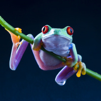 На рисунке изображена лягушка, сидящая на стебле зеленого растения. У лягушки выпуклые красные глаза, что характерно для некоторых видов, таких как красноглазая древесная лягушка.