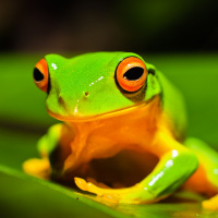 red eyes. It is sitting on what looks like a green leaf or plant, possibly in