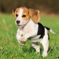 The image shows a young beagle dog running across a grassy field. The dog has a brown and white coat, and its ears are floppy. Beagles are known for their energetic nature and often make great companions due to their friendly and affectionate nature.