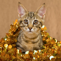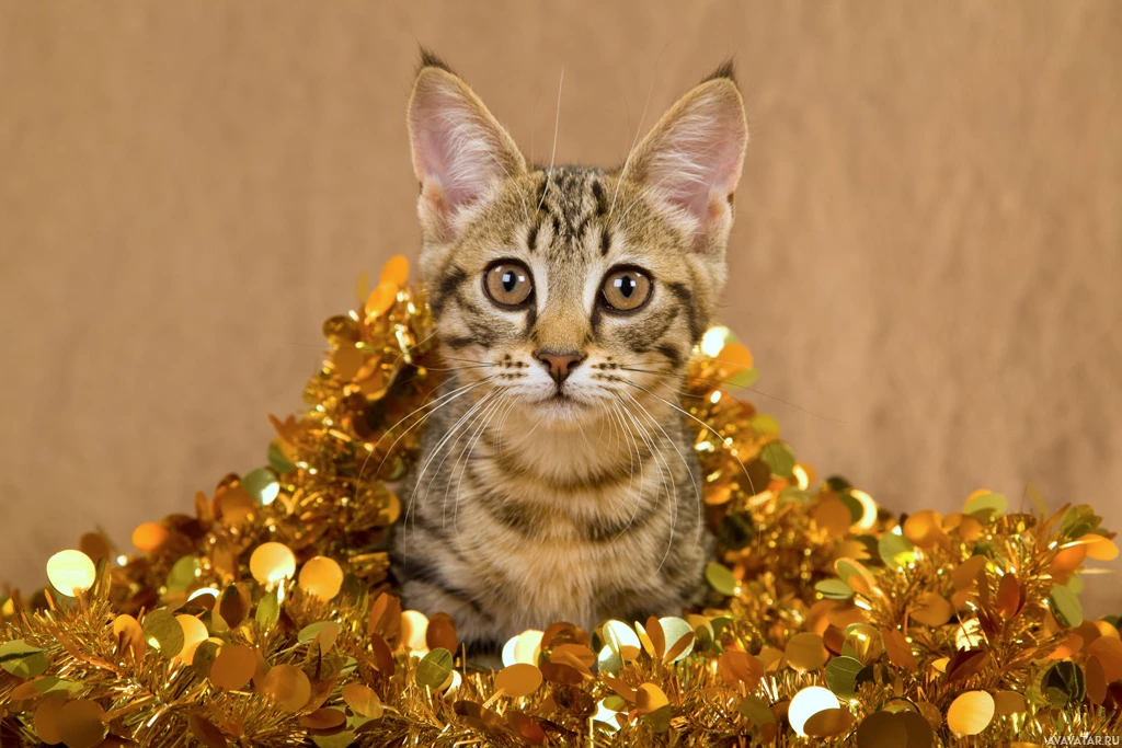 На фотографии изображен маленький котенок с полосатым мехом, который обычно ассоциируется с полосатыми кошками. Котенок сидит перед чем-то похожим на золотую мишуру или блестящий материал, который, возможно, используется для украшения во время праздников, таких как Рождество.