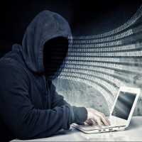 The image features a person wearing a hood and sitting at a computer. The individual is typing on the laptop, which has its screen glowing brightly with what appears to be digital code or