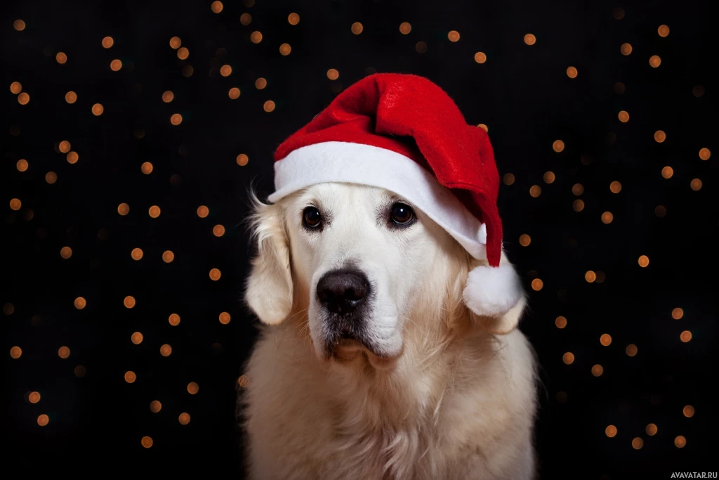 Christmas lights, giving the impression of a festive holiday scene. The dog is likely celebrating