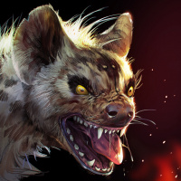 an open mouth showing sharp teeth and its eyes are glowing yellow. The background is dark and seems to be on fire or emitting flames, which might indicate the hyena's dangerous nature or