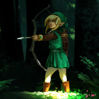 The image depicts a character from the "The Legend of Zelda" video game series. This character is known as Link and is seen wielding a bow in what appears to be a forest setting, likely in the midst of an adventure.
