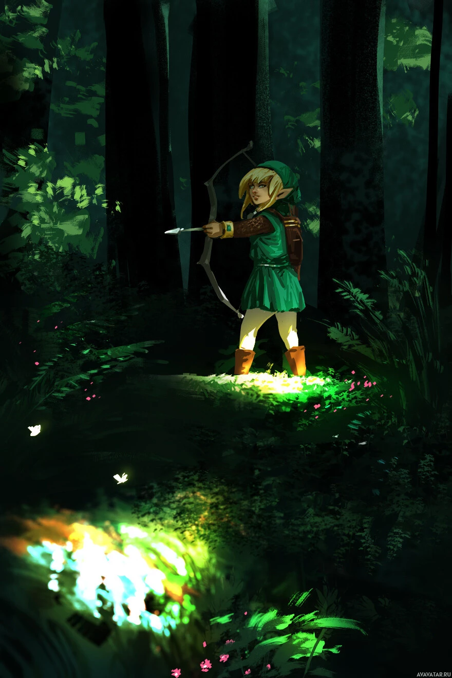 На картинке изображен персонаж из серии видеоигр "Легенда о Зельде". Этот персонаж известен как Линк и изображен с луком в окружении леса, вероятно, в разгар приключения.