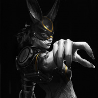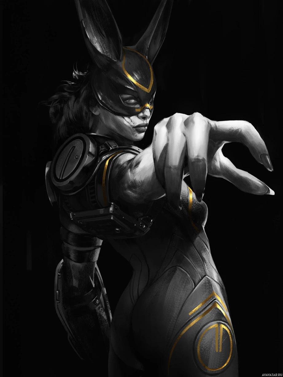 a female character wearing a full-body costume, which appears to be a blend of human and robotic elements. She has a helmet with what seems to be animal ears attached to it, possibly referencing a rabbit due to their