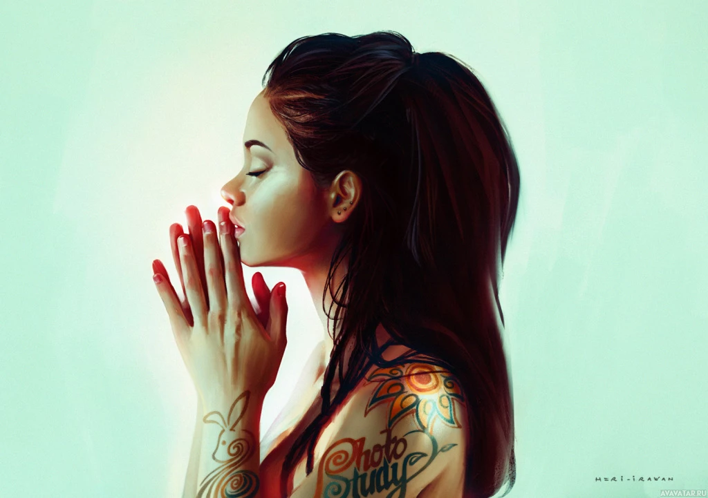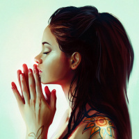 a brunette woman with closed eyes, appearing to be in a state of prayer or reflection. She has tattoos on her arms and is wearing earrings. Her hair is styled up, and she seems to have