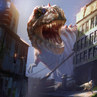 tall buildings and structures that have been destroyed or altered by the presence of these animals. There are also dinosaurs scattered throughout the scene, some closer to the viewer than others. This kind of imagery is often created for artistic purposes or as part of