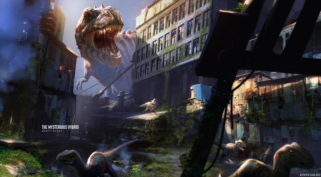 The image depicts a fantastical scenario where several prehistoric creatures, including what appears to be a T-Rex, are present in