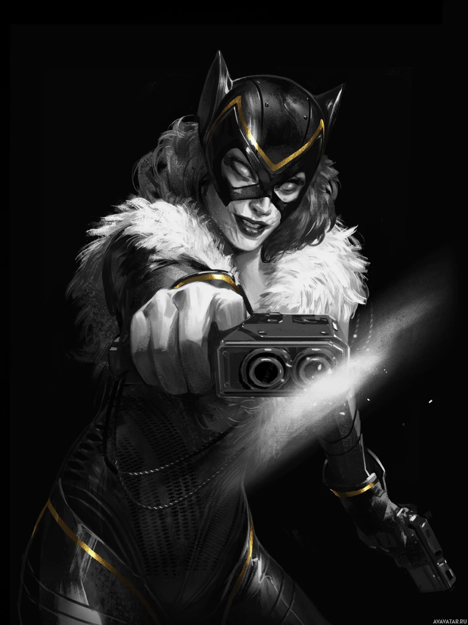 На картинке изображен женский персонаж, одетый в костюм с элементами, напоминающими пантеру, в частности, в маску и мех на плечах. В одной руке она держит пистолет, направленный на зрителя. Судя по одежде и позе, этот персонаж похож на супергероя или мстителя. Художественное оформление детализировано и вызывает ощущение действия и драматизма.