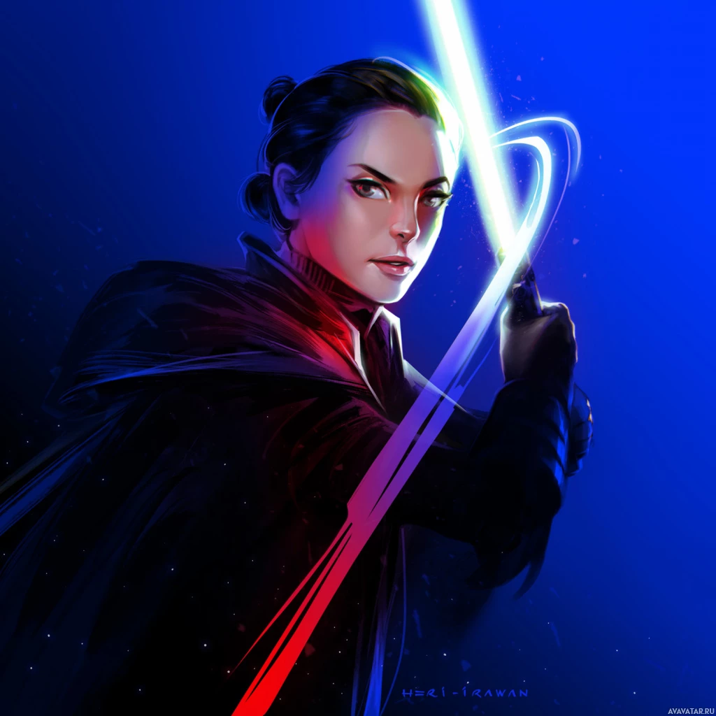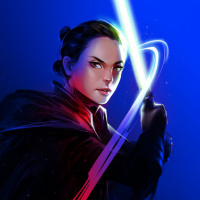 the Star Wars franchise, specifically Rey. She is depicted with her lightsaber drawn and held in front of her, suggesting readiness for battle or action. Her expression is one of intensity, which aligns with the thematic elements of the Star