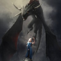 a fantasy scene with a character that appears to be Daenerys Targaryen from the television series "Game of Thrones." She is shown with her hair blowing in the wind, standing confidently next to