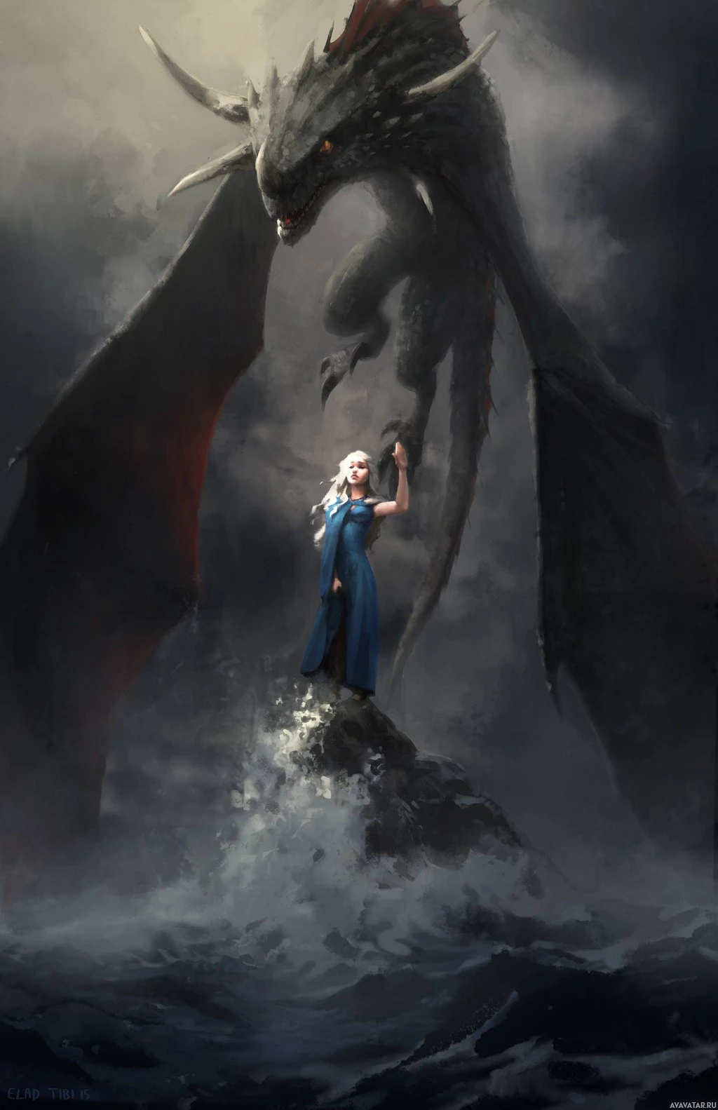 a dramatic backdrop that suggests a stormy sea. The overall atmosphere of the image is one of strength and resilience, capturing the essence of Daenerys' character as she embarks on her journey in the show.
