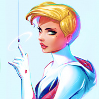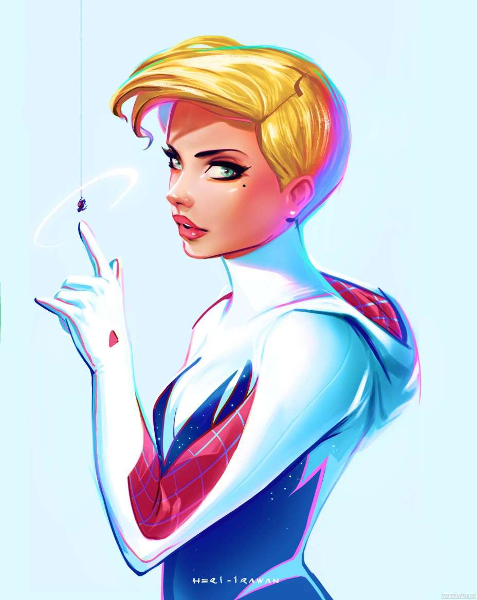 The image depicts a stylized, colorful illustration of Gwen Stacy from the Spider-Man comics. She is wearing her signature costume and has a confident expression on her face.