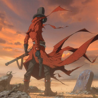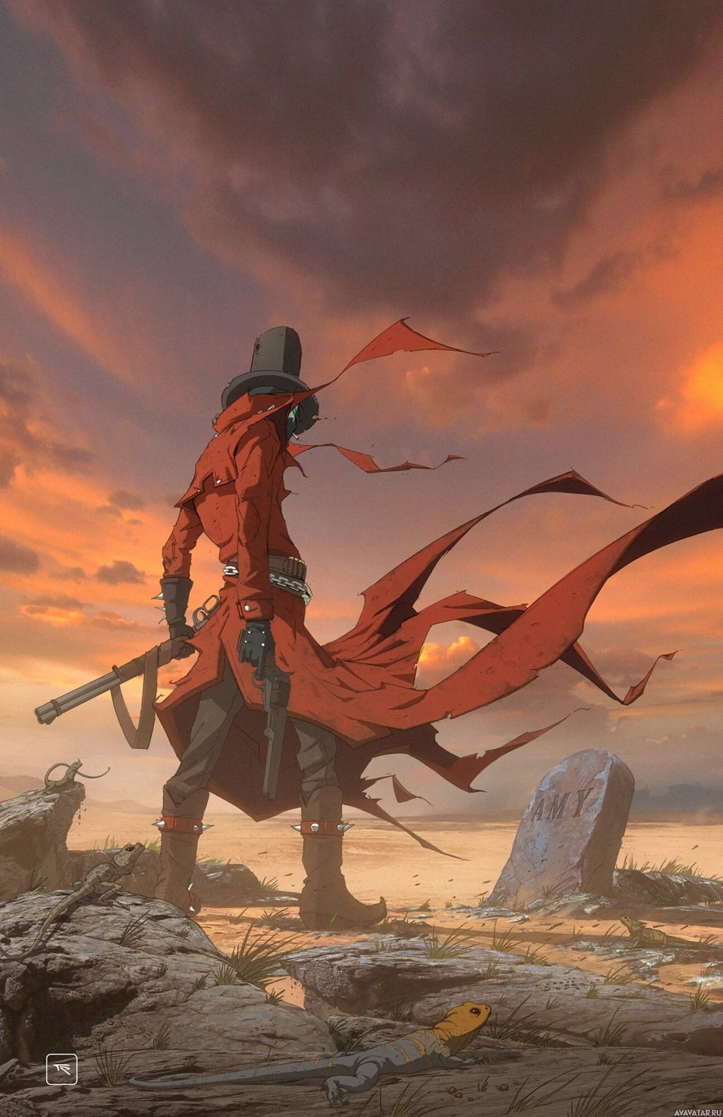 a red cloak that flows around them, and is holding what appears to be a pistol at their side. There's also a sword sheathed at their waist. The setting looks like a desert or