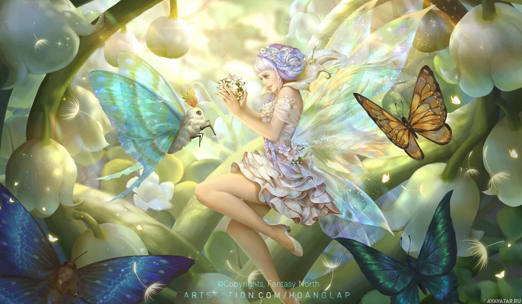 The image depicts a fantasy-themed illustration of a fairy-like character interacting with butterflies in a lush,