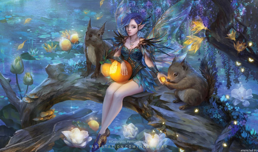 a fantasy scene featuring an anthropomorphic animal character. The central figure is a fairy with a human-like appearance, sitting on