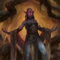 purple hair, pointed ears, and is adorned with various accessories such as jewelry, a cape, and what appears to be runes or tattoos on his skin. His pose suggests he might be casting a spell or preparing for battle. The style of the image is highly detailed, with a focus on fantasy elements.