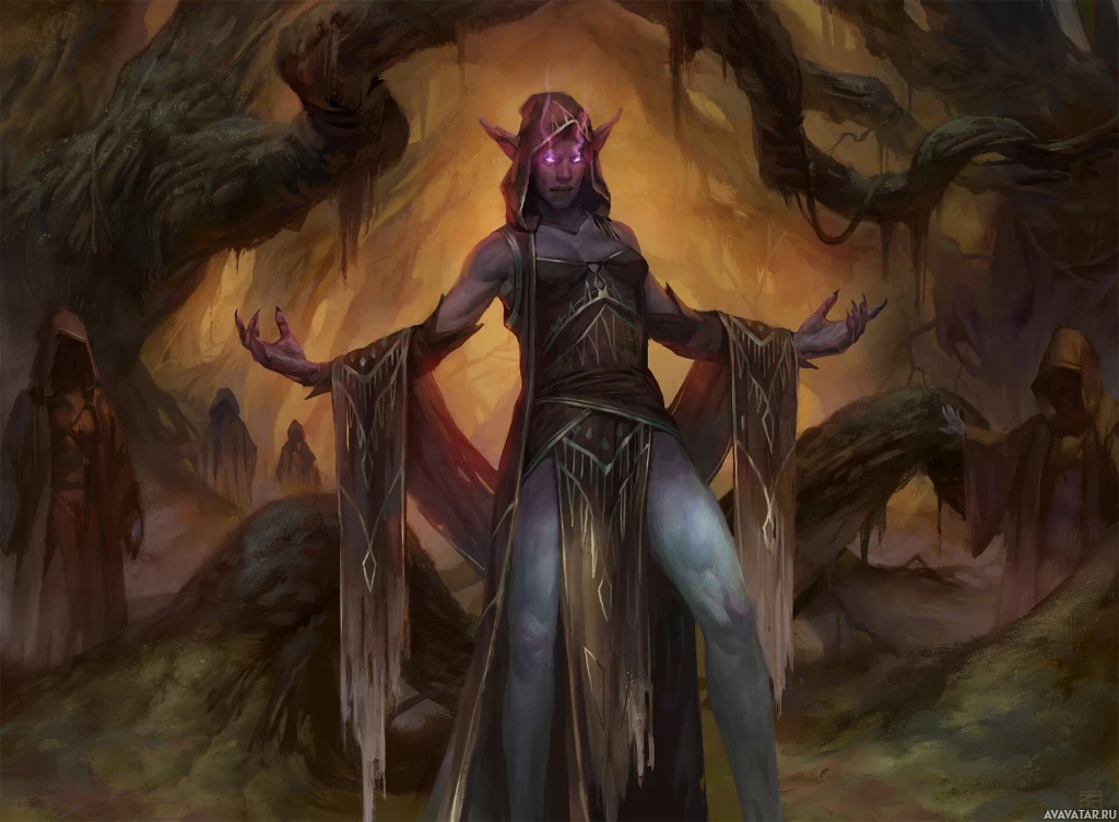 a fictional race of dark-skinned, slender elves in the Dungeons & Dragons universe. In this picture, the drow is standing amidst a misty, forest-like setting with moss and roots encircling him. He has long
