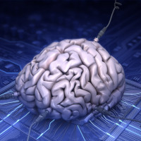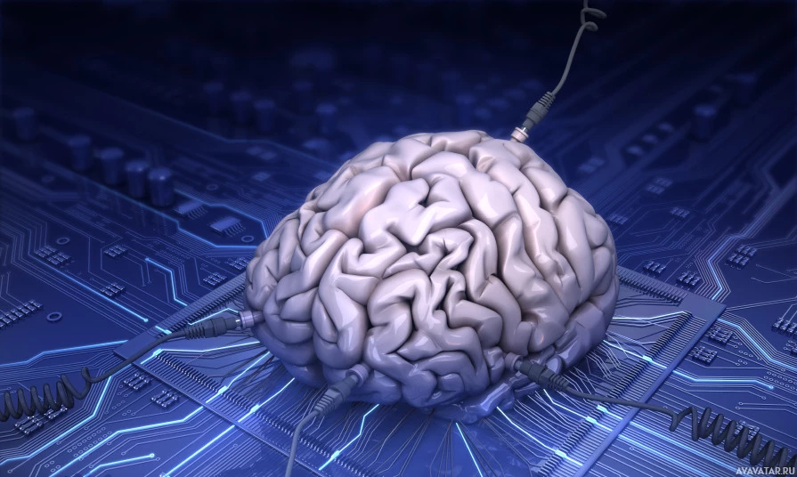 a human brain, which is the central part of the nervous system responsible for thinking, memory, and emotions. It's situated on top of an electronic circuit board or microchip, suggesting a theme of