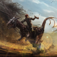 a person on horseback, facing towards the right side of the frame. The rider appears to be dressed in armor and is holding a sword, suggesting they may be a warrior or a knight. In the background, there is a large dragon-like creature with