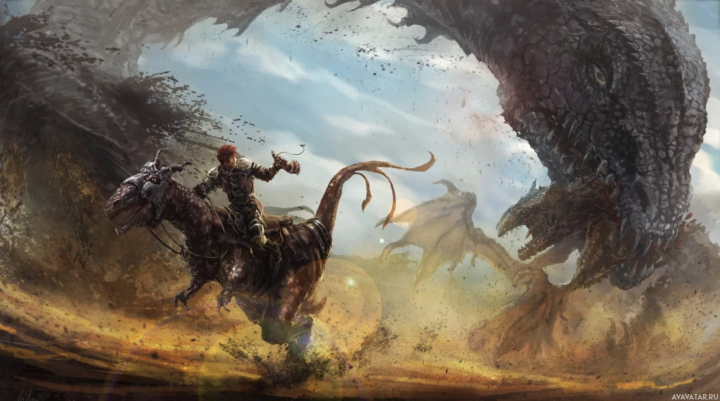 a barren landscape due to the dust kicked up by the creature's movement and the rider's horse. The image is vibrant, with dynamic poses from both the rider and the creature, conveying motion and tension typical of fantasy genres where heroic battles between humans and