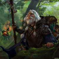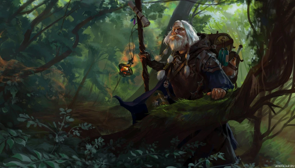 a forested area with thick undergrowth and trees around him. In his hand, he holds what seems to be a staff, suggesting a role as a wizard, sage, or similar figure within the context of