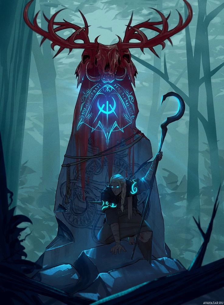 a deer with antlers, which could indicate a connection to nature or mythology. The background features a dense forest with mist and foliage, contributing to