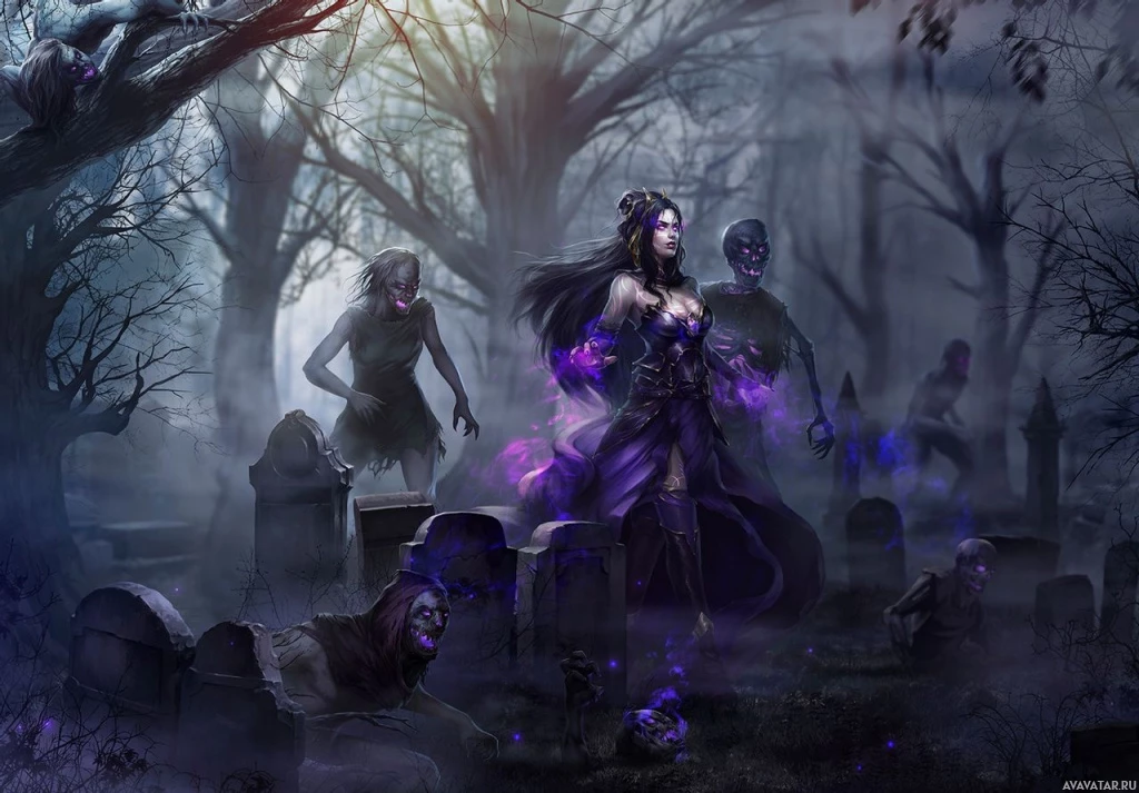 a male figure in the background on the left side of the frame, who seems to be undead like the others. The setting looks like it could be a graveyard or some other ominous location, given the presence of tombstones and