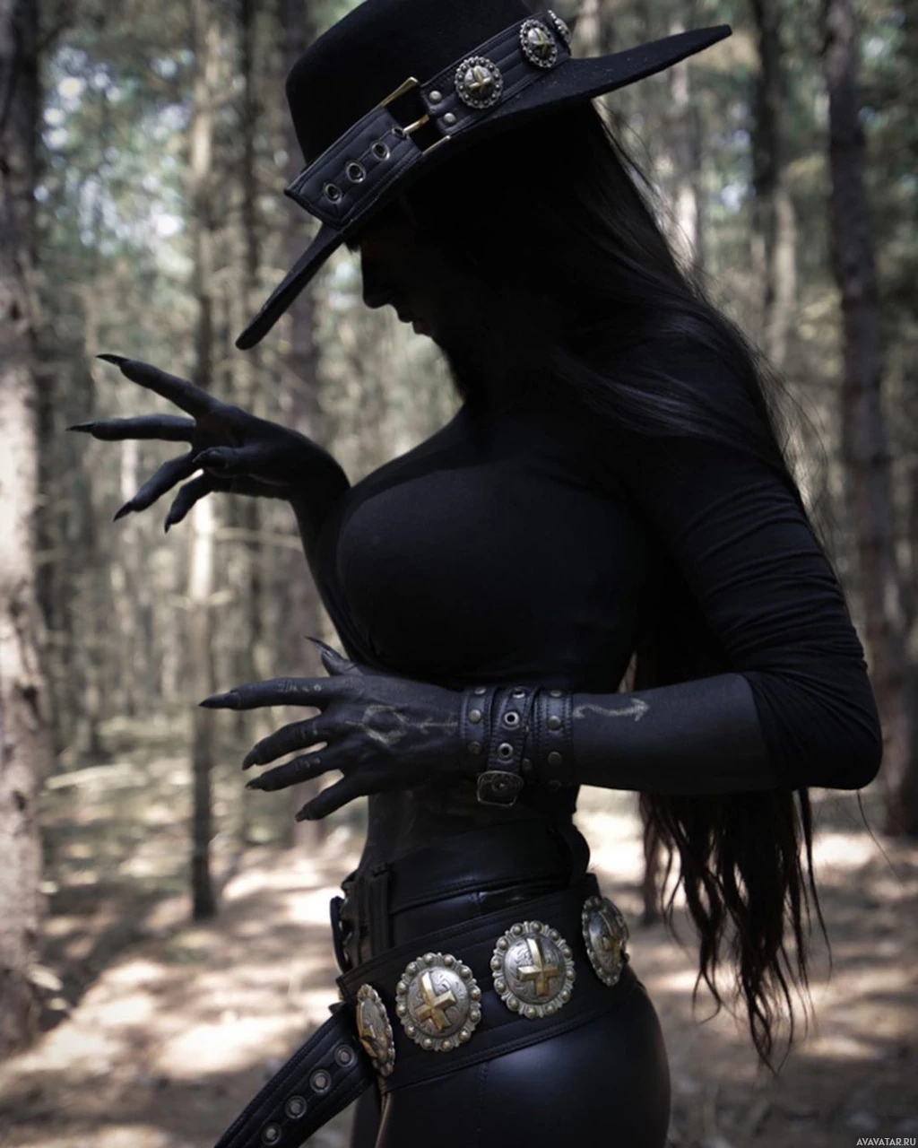 Morticia Addams. This individual is wearing a wide-brimmed black hat,
