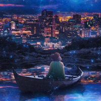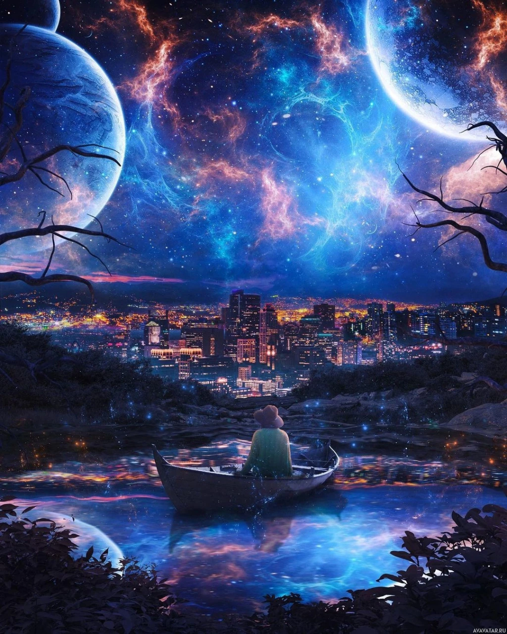 a city skyline with buildings and illuminated lights, creating a reflection on the water's surface. Above this scene, there are two large moons or