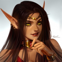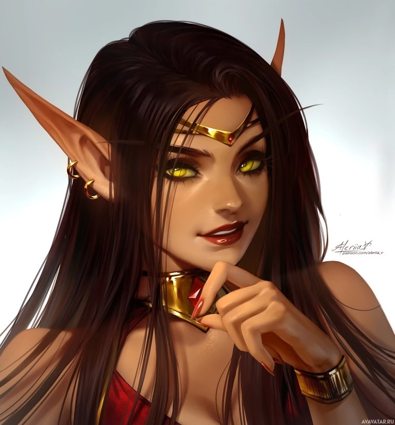 an illustrated character that appears to be a fantasy-themed elf. She has pointed ears, which is a common characteristic of elves in