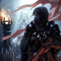 a female character, likely from a video game or fantasy story, depicted in an action pose. She is wearing a hood and a cape, which are common elements of