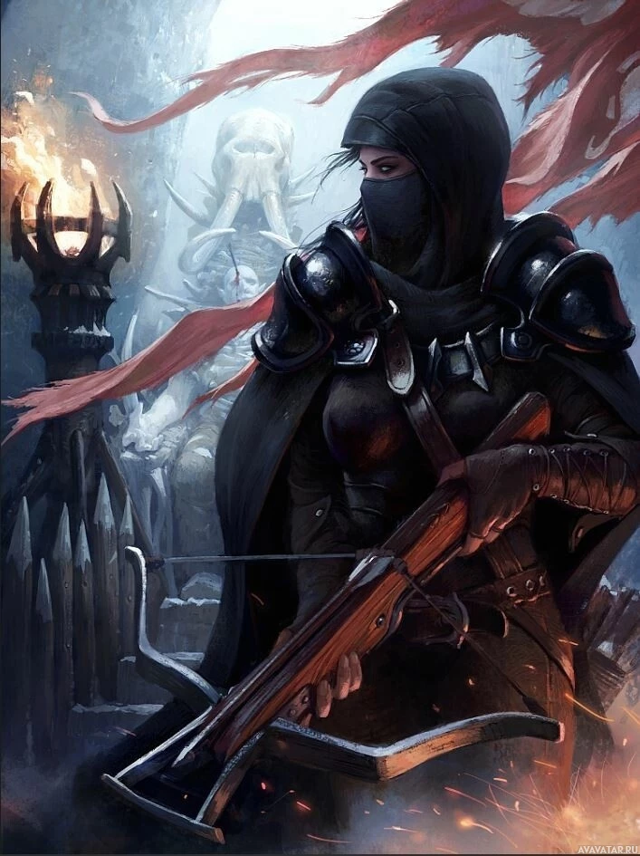 fantasy armor. In her hand, she holds a crossbow, suggesting that she is either about to fire it or has just fired it. The setting appears to be a dimly lit environment with gothic architecture in the background, enhancing