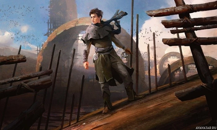 a male character standing in the foreground. He is wearing a medieval-style outfit with armor, suggesting he could be a warrior or someone from