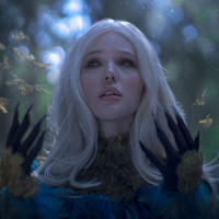 an ethereal look on her face and is surrounded by flying bees or insects. It appears to be a stylized image possibly inspired by the "The Witcher"