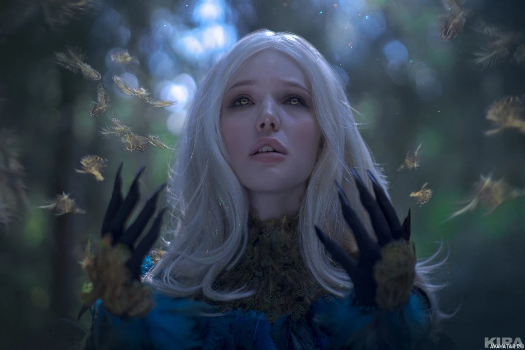 a young woman with blonde hair and pale skin, adorned in costume that could suggest a fantasy or cosplay context. She has