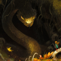 a tree branch. Below the snake, there is a character who appears to be a child or small creature with