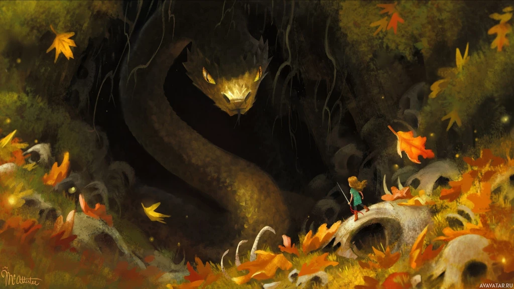 large eyes, looking up at the serpent with curiosity or fear. The scene takes place in an autumnal setting, with