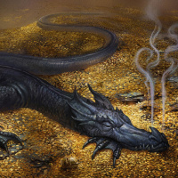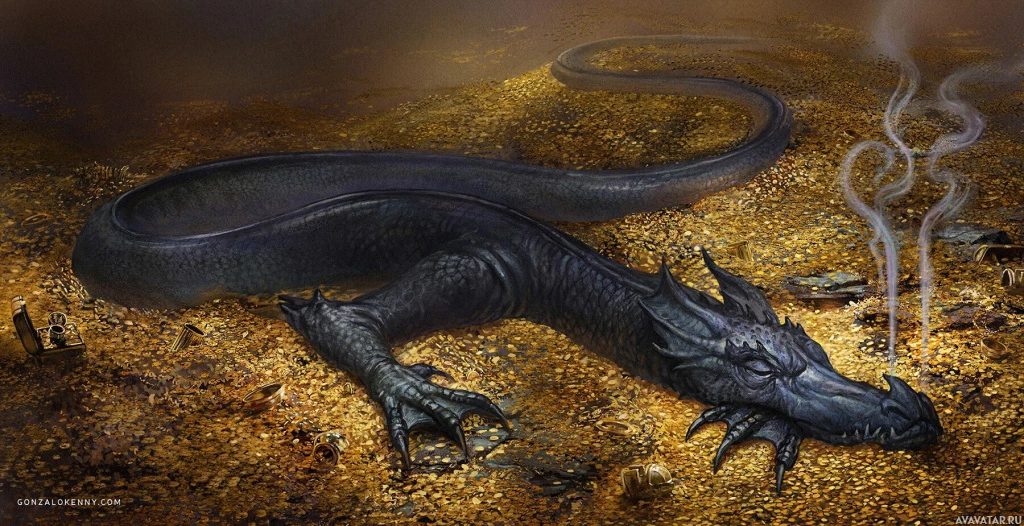 an underground cave filled with hidden wealth. The overall atmosphere of the picture conveys a sense of mythical or legendary significance associated with dragons and their hoards of treasure.