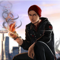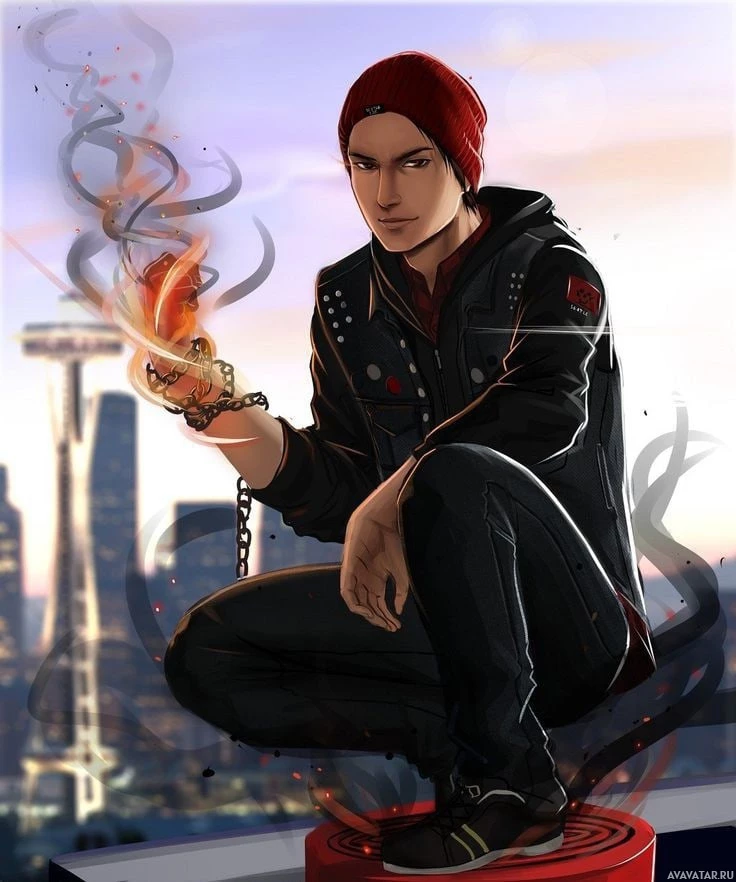 fire effect around his hand. The background suggests a cityscape at dusk, possibly inspired by Seattle given the recognizable Space Needle