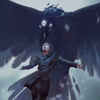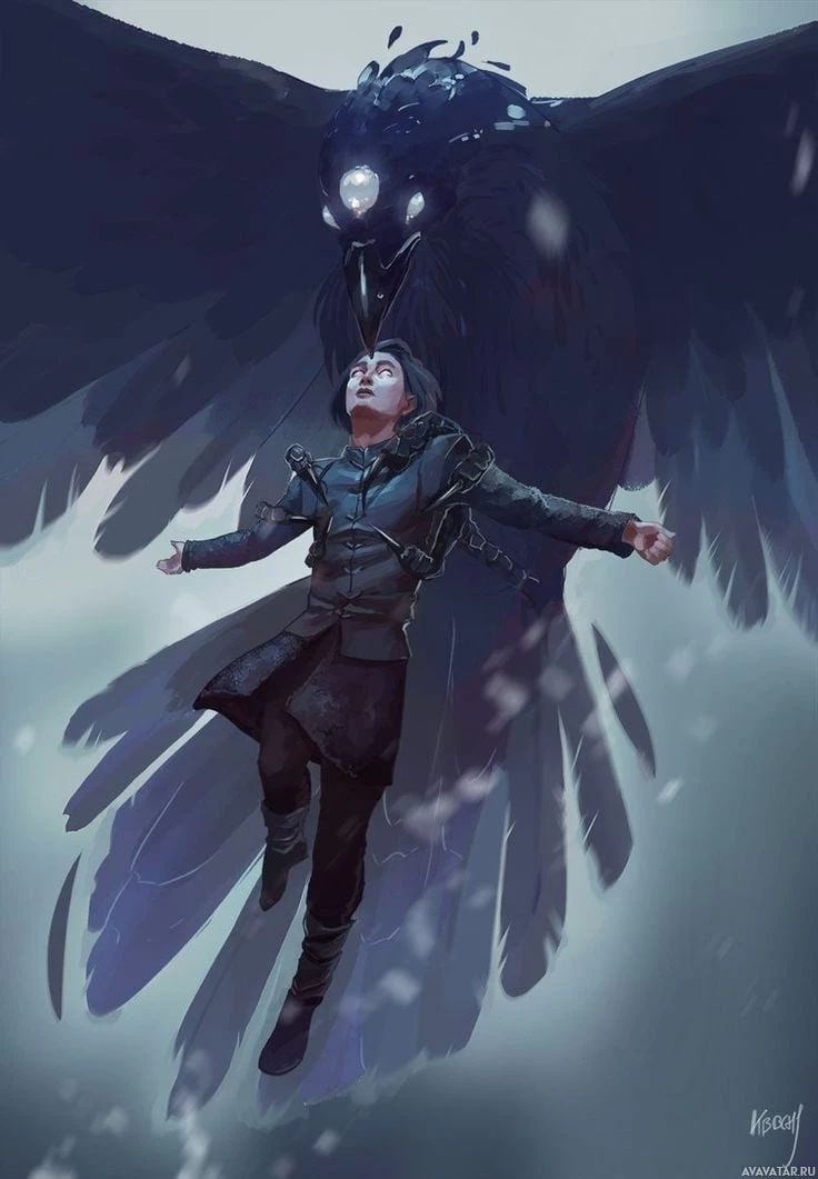The image depicts a fantasy-themed scene where a character appears to be lying on the ground, seemingly lifeless or in distress. Above them is a large crow, which has
