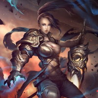 female character. She appears to be warrior or fighter, wearing armor and holding what seems to be a sword or staff in her right hand. Her attire suggests she might be from a medieval or mythical setting. The background is dramatic with fire and smoke, adding to the epic